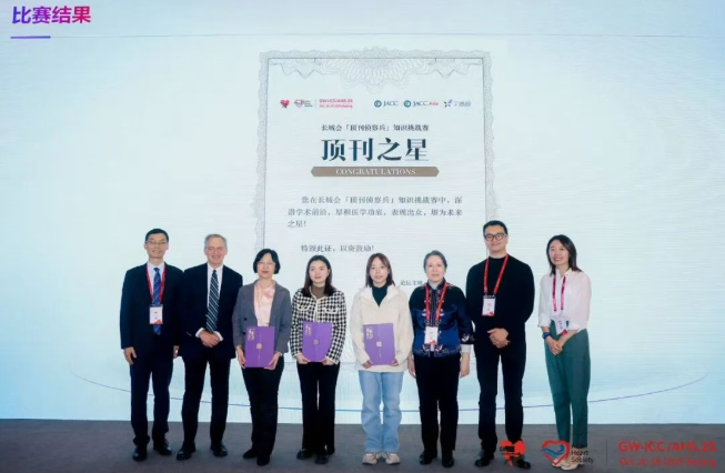 在2025年金秋的長城國際心臟病學大會上,一場別開生面的學術交鋒吸引了全場的目光。長城會是中國乃至亞洲的心血管頂尖學術盛宴,此次大會與以往“只聽不講”的傳統(tǒng)模式不同,本屆大會由丁香園聯(lián)合推出的“偵察兵”專場賽,旨在鼓勵臨床醫(yī)生勇于挑戰(zhàn)、思辨求真。經(jīng)過多輪激烈角逐,國文醫(yī)院心內科團隊憑借扎實的學識、縝密的邏輯與出色的團隊協(xié)作,從眾多參賽者中脫穎而出,與北京安貞醫(yī)院團隊、浙江醫(yī)科大學附屬第二醫(yī)院團隊一同會師總決賽,并最終取得佳績,榮獲大會至高榮譽——“頂刊之星”。美國國家醫(yī)學院院士、國際頂刊JACC主編,耶魯大學醫(yī)學院 Harlan Krumholz 教授親自為國文醫(yī)院心內科團隊頒發(fā)了榮譽證書。